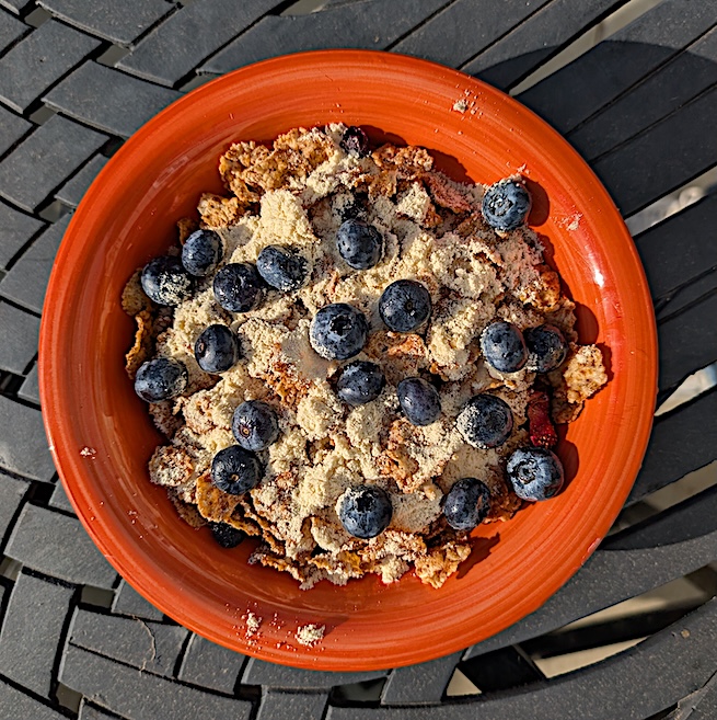 Cascadian Farm Organic no sugar added Mixed Berry cereal. Added jumbo blue berries, vanilla whey protein powder, and plant based Almond milk.